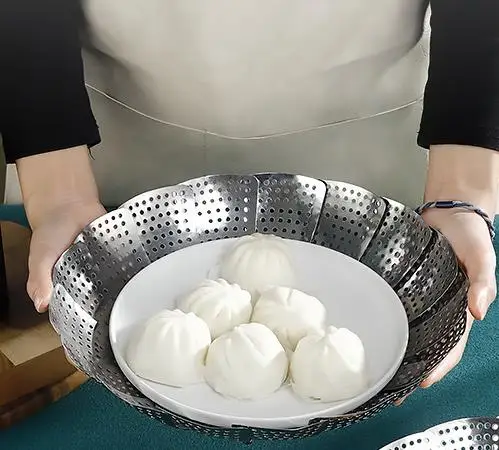 6. A cesta do vaporizador pode dobrar para armazenamento e expandir para caber em vários tamanhos de potes / panelas e panelas de pressão, transformando sua panela favorita em um vaporizador seguro. Ele se abre como um lírio d'água e se dobra de forma compacta para economizar espaço de armazenamento. Parâmetros do produto: 100% novo e de alta qualidade Material: aço inoxidável