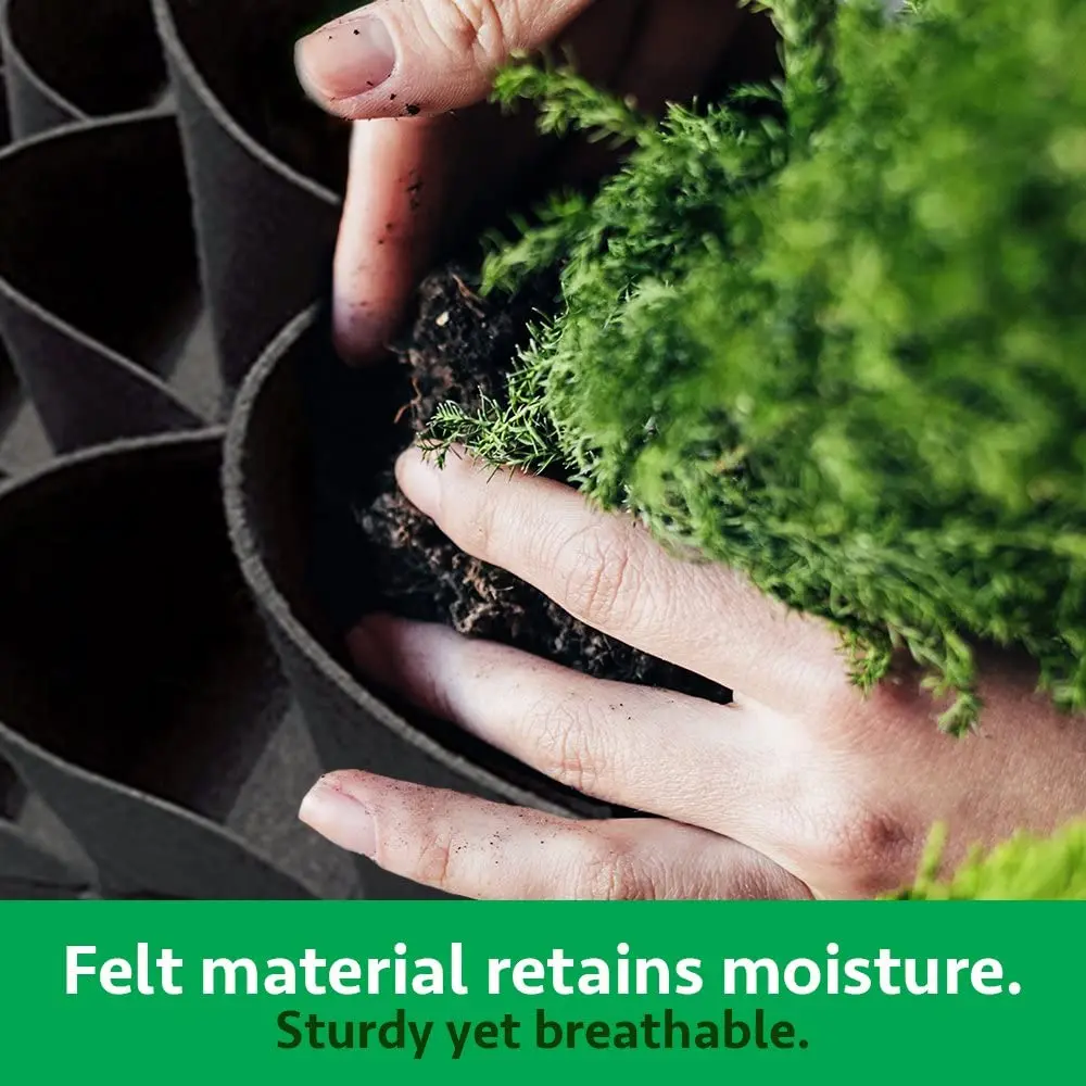 Material de Alta Qualidade: Acreditamos em fazer nossa parte pelo meio ambiente, e é por isso que escolhemos o pano de feltro de alta qualidade como material principal. Não apenas é um material ecologicamente correto, mas também oferece benefícios inatos para o crescimento das plantas. O ambiente proporcionado por esses bolsos de jardim suspensos é ideal para uma variedade de espécies, desde ervas aromáticas até morangos suculentos, flores exuberantes e vegetais frescos.